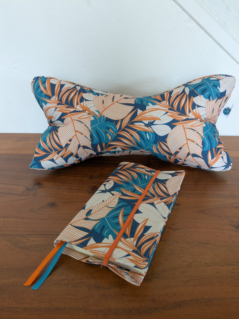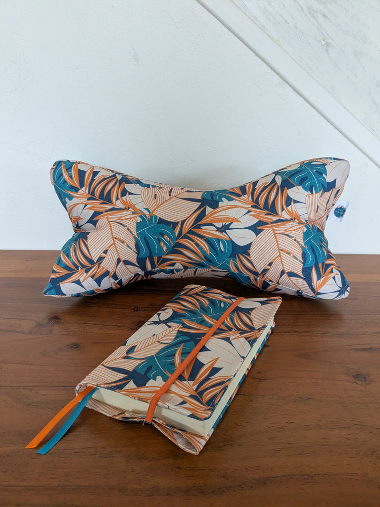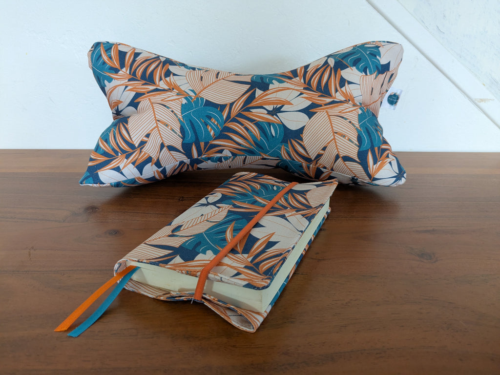 Coussin de lecture & Protège-livre ajustable – Motif Jungle bleu| Fait main